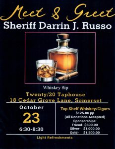 Meet Sherriff Darrin J. Russo, your current Somerset County Sherriff running for re-election, for a Whiskey Sip at Twenty/20 Taphouse on October 23 from 6:30-8:30 pm.